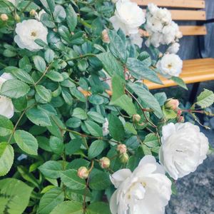 ベンチ横のバラ カタリナツァイメットさんが半つる性なので良い感じに垂れて咲いてます