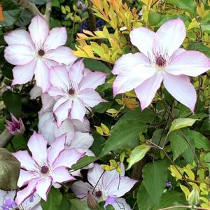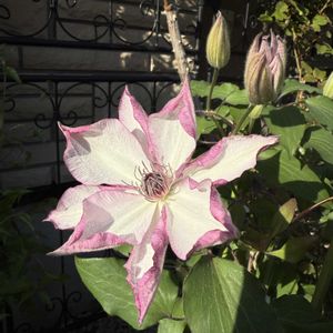 クレマチス オモシロ(面白)💗 二番花です。ひとまわり小さくてピンク色は淡くなり、ほぼ白で咲いてます。 これも可愛いんです💓