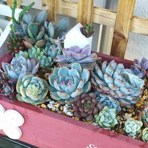 おはようございます☀ 皆様stayhome🏠頑張ってますか? 私も普段やらない事をして乗り気っています。 以前植えた鉢に飾りを付けて遊んでみました。 少し可愛くなりましたよ。 もっと作ろうかな。。 水ギレなのでこの後お水をあげます。。 シャングリアがまだオレンジ色で、プクプクしてて可愛い😍😍😍 センぺルも沢山の子株が。。😊 パンジーは紅葉が冷めた💦