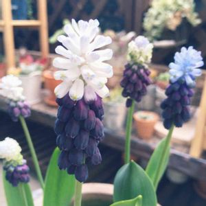秋に球根を植えたムスカリ✨ キレイなツートンカラーで 咲いてくれました〜😊 右奥の子だけ水色の帽子を かぶってます💧