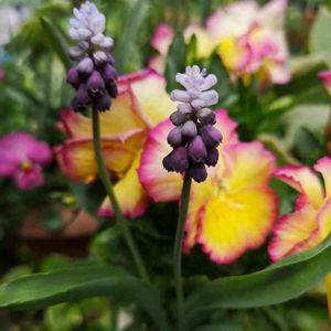 ムスカリ グレープアイス🍇がチューリップの寄せ植えの足元で咲いています♪ 紫のグラデーションがとても綺麗なムスカリでした!