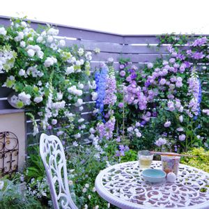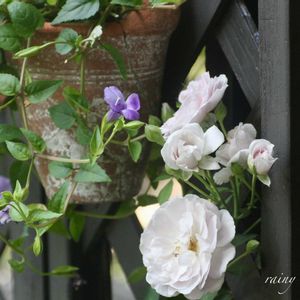 おはようございます クレマチス八重 「ダンシングスマイル」と 薔薇「レイニーブルー」のコラボ クレマチス八重 「ダンシングスマイル」は 4月末から咲き始めるので 早咲きの薔薇とコラボ出来ます 「ダンシングスマイル」の咲き始めが 私 大好きです 今朝も🏠庭パト中 ご近所さんが来て クレマチスを薔薇だと 思われてたみたいで 「これクレマチスなんですよ」って 🤭🤭 確かに似てる💗 クレマチス壺咲き「天使の首飾り」 とコラボの薔薇 「レオナルドダヴィンチ」も 今朝 綺麗に開花 クレマチスのarrange