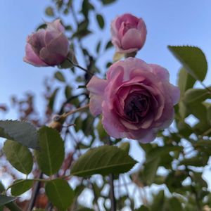 🌹レイニーブルー レイニーさんもポツポツ咲いています♩ 風で大揺れの中パシャリ🤳 奇跡的に2枚目で真ん中におさまりました😆 夏剪定しなかった組☺️ 冬の誘引先など準備中です😊