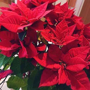まだまだ元気なポインセチア 今まで なんども買ったけど、その年のクリスマス前には枯れておしまいでした。 しかし GSで知って以来、今年は 水やり、陽に当て など 丁寧に育てたら こんなに元気でいます。 当たり前かな? いつもはクリスマス前には下の葉がくるくる丸まって枯れて落ちてしまいました。 なので一生懸命水やりして、天気の良い日は外に出して 日光浴。それが皆悪かったと 反省です、 来年には このまま元気で 綺麗なポインセチアをUP出来ますように。⭐︎ 写真の角度で ちょっとピンクっぽいけど 実際は真紅です。❤️