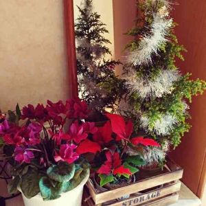 ささやかなX'mas💛🌿 . 夏越ししたゴールドクレストに 白モールを飾りつけ✴ ちょっとだけX'masな玄関にしました✨ . シクラメン🌼は 昼間は窓辺のひなたです 写真を撮るので ゲスト参加してもらいました ( 〃▽〃)💛