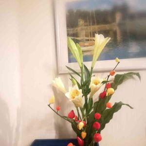 受付のお花です。 楽しい作品ができました😊 テッポウユリは、もっとスッキリ使えばよいと思っていましたが、つぼみが多く💦結局そのまま使いました。 暑さで花持ちが悪いこの時期、トウガラシも面白いですね。