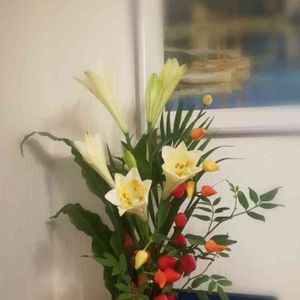 今週の受付のお花です。 笑っちゃいます。 なんでこの組み合わせにしちゃったんだろ😅 ビックリ箱みたいになっちゃいました。大丈夫でしょうか。 普段なら絶対選ばないミリオンバンブー…しかもこの賑やかな色合い…、ちょっと疲れてたかも😅💦