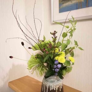 秋色、大きめ作品。 実家の応接間に飾ったアレンジ。 エルシェイプ応用 ちょっと花材不足(^_^;)もっと実物プラスしたいな。