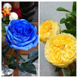 知人に見せていただいた珍しいバラをご紹介します🌹 青いバラは、国内の作家の方が育てられた名品だそうです✨切り花で入手されました。大きくて真っ青でした😳神秘的❗ 黄色のバラも切り花ですが、かなりの大輪で、素晴らしかったです✨