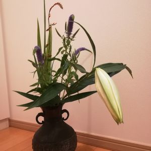 お庭のカサブランカを生けました。 今年は1本しか出ませんでした…そろそろ咲きそう💕帰宅したら、みんなが見られるように、家の中に飾りました。