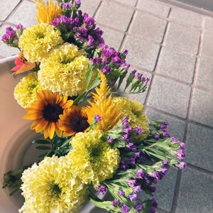 《今日の仏花》 ①②仏花用に✨️ 花材はアフリカンマリーゴールド、ジニア、ヘリクリサム❁⃘*.゚ ③他の花材は玄関用に🌸 アスター、ヘリクリサム、 ジニア、スターチス アスターがこれにて終了🥹 今後の仏花はまだまだ元気なアフリカンマリーゴールドをメインにしようかな❓ 蕾をたくさん付けてる菊も 楽しみ🥰