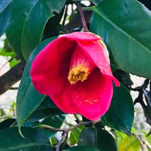 《やぶ椿》 やぶ椿の花も咲きました🌺✨。 赤色で一重咲き、おちょぼ口の椿です😊💕。 20年くらい前に、両親所有の山で採取して、自宅の庭の北側に植えました👩🏻🌾。 現在では、樹高2.5m位になりました。裏庭に控えめに咲いていますが、優しい雰囲気で存在感のある椿です🤗❣️。