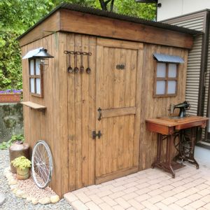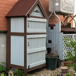 古いスチール物置をガーデン小屋🏠にリメイクしました❤ 冬頃から少しづつ作業し、ようやく出来上がりました!嬉しい~😆 時々、窓から覗いてはニヤニヤしていま~す🎶🎶