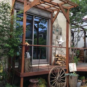 パーゴラ ガーデンの印象をググッと上げてくれるシロモノです。 置いてある車輪も必須かな。