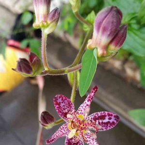 ホトトギス咲きました😁😆👍✨陰にミニチュアダックスのくうちゃんがいます😁🐶🎵