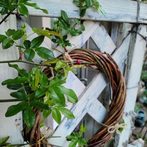 白モッコウバラをリースの枠に絡めてみました😁咲くのが楽しみです🌼🌱🌹