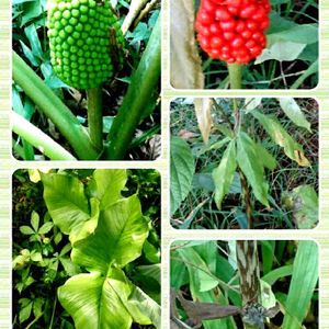 【似てるシリーズ】 左側の写真 ムサシアブミ(武蔵鐙) 右側 マムシグサ(蝮草) 左側の実も、右側の実のように、そのうち、きれいな赤い実になります。 これらは、葉っぱ、茎の模様が違い、種類が違うんです。 調べてみた限りでも、同じような実を付ける植物として ○ムサシアブミ ○マムシグサ ○ウラシマソウ(浦島草) ○テンナンショウ(天南星) という名前が上がってきました。 どれも、サトイモ科の植物です。花を見れば区別しやすいようですが、実では、区別が難しいです。 しかし、葉っぱや、花茎と葉茎の付き方で、何とか見分けてみました。 ○ 左側の写真の植物 葉っぱが、人の手のひらよりもずっと大きい葉っぱです。 これは「ムサシアブミ」(武蔵鐙)です。 ムサシアブミという名前は、武蔵の国(東京都・埼玉県)で生産されていた鐙(足を掛ける馬具)の形に似ていることから、付けられたそうです。 ○ 右側の写真の植物 葉っぱが細めです。 そして、花茎が地上で葉茎の間から出て立ち上がっているので、マムシグサだと思います。 ウラシマソウは、地下で葉茎が分岐し、花茎は土中から直接出るそうです。 そして、茎の模様が、ウラシマソウと異なり、名前の如く、蛇のマムシの皮膚のような柄をしています。 ん~ん、実際にマムシグサを見た時の気分は、良くないです。植物と分かりながらも、「もし、本物のマムシだったらどうしよう😱」、「噛まれたらアカン😵🤢🤖」と思ってしまいました。 ムサシアブミも、マムシグサも、実を摘まんで食べたくなりますが、これらには毒があり、絶対に口にしてはいけないものだそうです。 恐ろしい😖