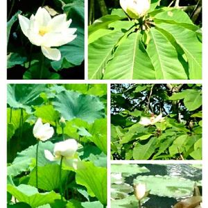 【白いお花&似てるシリーズ】 ○左上&左下 蓮の花です! (平成30年7月23日、福岡市舞鶴公園のお堀にて撮影) ○右上&右中 今日、松島の近くで出会った 朴の木(ホオノキ) の白いお花です。 泰山木も、似たお花だそうですが、朴の木は、葉っぱが大きく、波打っているのが特徴的です。 日本三景の「松島」の美しさは、松島から南に海岸線を走り、途中の展望台や海の方に降りて行った所からも、十分に味わうことができます。 海岸線から少し入った所で、崖の下の方から生えている高い木の上の白いお花を見つけました! 蓮の花みたいだと思いました! しかし、蓮が高い木の上で咲くとは、聞いたことがありませんよね。 ○右下 睡蓮の花 (平成29年8月1日奈良市氷室神社にて撮影) 睡蓮の花が好きですので、ここでも登場してもらいました🙇