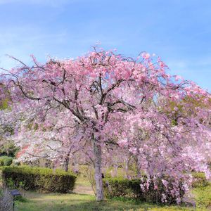 🌸🍃平安神宮〜神苑 こちらの桜は、遅咲きの「八重紅枝垂れ桜」ピンク色が濃い目で咲き進むと淡い色へと変わります。 ①② ③南神苑より 📝八重紅枝垂れ桜 元々近衛家の糸桜を仙台藩主が持ち帰り育て、明治28年創建時、仙台市長から再び寄贈されました。そのため「里帰り桜」と呼ばれています。 また、文豪谷崎潤一郎の小説「細雪」にも登場する春を代表する人気の桜となりました🌸