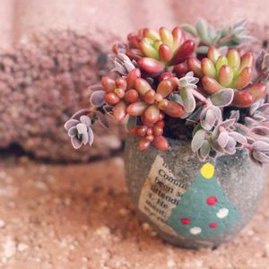 玉殻セメントは作家さんの作品。クリスマスバージョン。去年から植えたままだった虹の玉のスキマに紅くなってきたレモータを入れました。