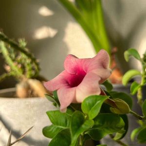 パープルアラマンダ 珍しいお花と思って買ってきました。寒いのにちゃんと顔あげて、もう何日も咲いています。キョウチクトウ科の花だそうです。