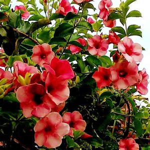 🍀ムラサキアリアケカズラ🍀 神戸さんちかのハンギングに 優しい色合いの筒状のお花 有明葛(アリアケカズラ) アラマンダ ブランシェティとも 言います キョウチクトウ科なので毒性が あるようです