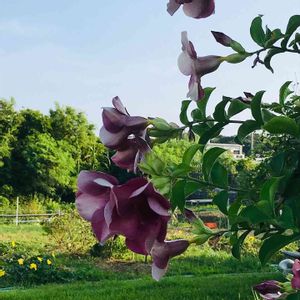 おはようございます!(^^)! 今日のお花はノウゼンカズラですが、これはアラマンダ!💜💜💜この頃、パープルバージョンを育てている方が多いですー!