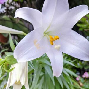 12月に顔🌱を出した『テッポウユリ』のお花が咲きました๓´˘`๓♡九州以南のお花と初めて知りました🎶 今年は株が増えて4本です🎶でも…茎が細くて頭が重くてうつむいたまま…(>︿<。)💦過保護過ぎたかな〜💦毎年放ったらかしでも元気に育ってたけど…今は棒で茎を支えてます( ̄▽ ̄;)