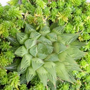 ド真ん中の日に参加しまーす🎶(⋆ᵕᴗᵕ⋆).+*ペコ 11月にpicした子🌱✨ハオルチアちゃんの鉢にお隣のマンネンクサちゃん侵入で…もうキツキツに( ̄▽ ̄;)💦 …って言うか、この子、マンネンクサなのか⁉️お花も咲かないし…なんだろな•́ω•̀)?