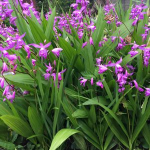 蘭の仲間ですよね? ナーセリーの石壁の際にたくさん植えられています。 もっと白っぽいのもあるので、紫蘭とは違う種類かと。