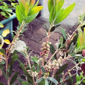 我が家に初めての🇦🇺の花木 いつもの花屋さんの 店頭に並ぶ100均の棚 いつもここはチェック サラッ と見て他へと足が向いたら、 他の方が金宝樹だって聞こえて 戻ったら、 ホントだ❗しかも蕾がある、 でも何処に植える❓️🤔 まぁなんとかなると 思ういい加減な性格はレジに並ぶ😵 ポットのままで明日考えようと。 朝から雨☔️ 見たら昨日の蕾は今日の花 咲き始めちゃったわ😲 気温が低いのに開花は進む。 明日はプランターの何処かに突っ込むか❓️ ブラシの木は赤い花と思ってたけど、白?緑?も悪くないかな フトモモ科 ブラシノキ ボトルブッシュ ボトルブラシ