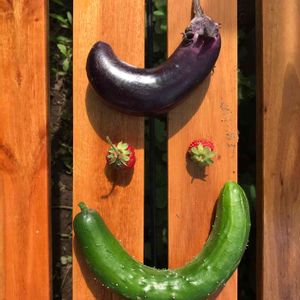 お庭の小さなプランターから採れたて野菜です🍆🥒🍓なかなかずっしりしていますが曲がっているので主人の似顔絵を描いてみました🙋🏼♂️🍃👀