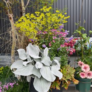 ①通りに面した花壇に植えたリーフです ビオラと一緒にお迎えした時期は 寒さで縮こまっていましたが 暖かくなって俄然やる気アップ⤴️ タグを見たら“高温多湿が苦手・ 夏場は西日の当たらない涼しいところに”とありました 鉢上げするか悩むなあ。。 ②日向からバラの足元に引っ越したギボウシ 雨粒と木漏れ日でいい感じです🍀