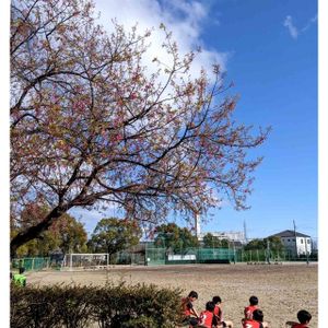 おはようございます 昨日の朝は雷と雨で大変な天気の中 中1の孫ちゃんのサッカーを見に行きました。少し小ぶりにはなったんですが、初戦は泥にまみれての試合でしたが、勝ち進んで臨んだ二試合目はご覧のように素敵な青空になりました😊(勝ちました❗) 校庭の大きな木に咲いた赤色のお花にようやく気づいて📷 赤いユニフォームが素敵に映ります