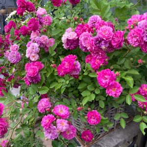 ミニバラ スイートチャリオット🌹 横張り性が強いので 枝が 四方八方に伸びてます ハンキングにした方がいいかな 香りも楽しめます♫ 3枚目は、オールドポート🌹 このくらいの開き具合が可愛い🫶 香りもよきです❣️
