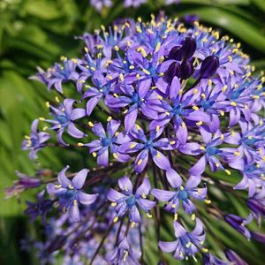 🍀🌻🪴💐🌹🌻🍀 🍀💙シラー・ベルビアナ💙🍀 池田ハーブセンターのガーデンに珍しい花を見つけました、大型の花でした 💐シラー・ペルビアナの花言葉は(辛 抱強さ) (多感な心) (哀れ) (寂しさ) (変わらない愛)などです 💐シラー・ペルビアナはキジカクシ 科ツルボ属(シラー属) の植物で原 産国はユーラシア大陸、熱帯アフ リカ、南アフリカなどです 💐シラーの学名はScillaです、学名を そのまま呼んで植物の名前となり ました、このScillaはギリシア語で (害になる)という意味のSkylloが語 源となっています 💐シラーの特徴は星形の花やベル状 の花です。大きさは種類によって 異なり5センチ程度の小さな物か ら80センチのものまであります 💐花期は3月から6月で、花の色は青 紫、ピンク、白があります 💐シラー・ペルビアナは傘状に咲く 花で、見た目も個性的です、花の 色は青紫で、シラーのなかでも大 きくなる種類です 🍀🌻🪴💐🌹🌻🍀
