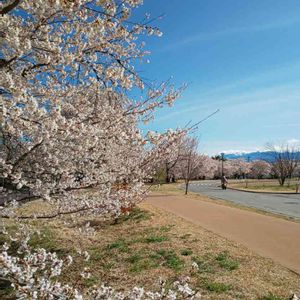 満開の桜並木と八ヶ岳 「いきいきの森」遊歩道にて