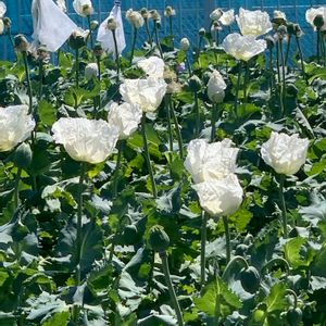 けしの花 鉄格子、鉄条網で厳重な管理の中で栽培 されています。 (東京都薬用植物園にて)