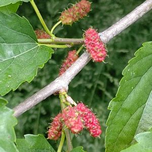 クワの実です。 自然大好き派😘です。探鳥会に出かけたらご覧のようにクワが実っていました。もちろん取って食べました😊。食べるのは黒く熟した実を食べます。子供の頃はこれで育ったと言っても過言では無いくらい沢山食べました😅。当然、唇🫦や舌👅はドドメ色(赤紫色)になりました。子供の頃を思い出して手を伸ばしましたが今食べても十分美味しいと思いました😊。 クワはカイコの「食う葉」が訛ってクワになったと言う説が有力みたいで、私もこれを支持します。養蚕は無くなりましたが、 少し田舎に行くとこの木が方々で残っており、見るたびに子供の頃を思い出します😊。
