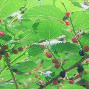 桑 クワ 桑の実も熟れてきたね。 見えにくいけど、右上隅の黒い実が、熟した実だよ。 よく投稿されてる、桑の葉と、少し違うね。 葉に深い裂が入ってる。