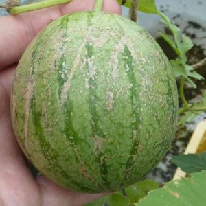 ミニミニ ミニスイカ ベランダでプランターで空中栽培しました。ミニと言うよりか、孫スイカ。