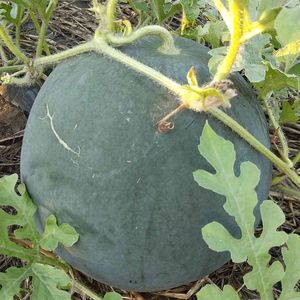 畑のスイカ🍉 だいぶ大きくなって今直径が25cmぐらいになっています🤗 収穫が楽しみです💕 甘いといいなぁ〜🤗