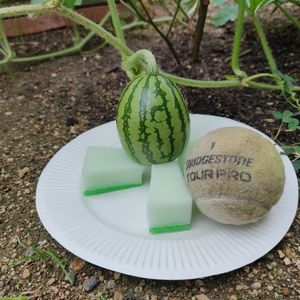 スイカ栽培のその後 人工受粉8日後 テニスボールと比較してます。 市販の栽培用発泡スチロールのマットは 超高いので百均の皿に水抜きの穴を開け、切ったスポンジでスイカをホールドするよう自作しました😅 他のつるの実も大きくなってきましたぁー🤗 このまま、大きくなぁ〜れ、大きくなぁ〜れ🤣