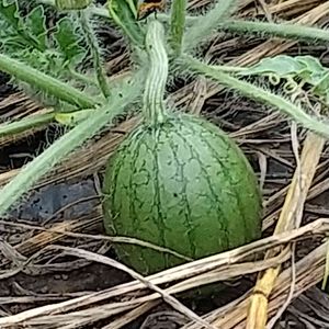 スイカ🍉 今年初めての子 ここまで丸々育ってきたので 鳥たちに狙われないよう ネットで保護