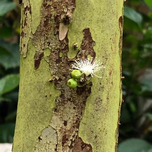 ジャボチカバ🌱 幹や枝に直接花や実がつく。 緑の丸いのが実で熟すと巨峰くらいのサイズになる😊美味しいのかな🤔 温室ではさまざまな不思議植物に出会えます✨