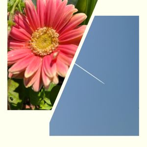 青空に飛行機雲が✈️くっきりと しかし暑い。ただいま33度💦💦 我が家のガーベラが咲きました。