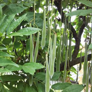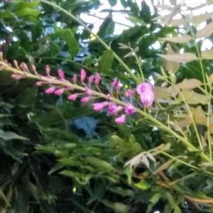 藤 長梅雨で、7月は、涼しかった。 何を勘違いしたのか、藤の花が咲いてる。 色は、春とは、随分違う。 藤色というより、ピンク。 沢山の、長い種と一緒に、咲いてる。