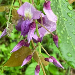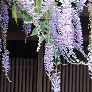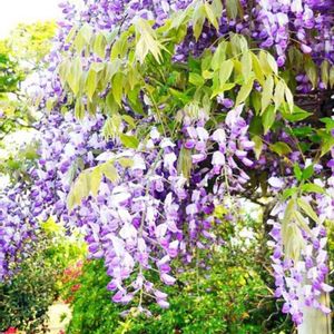 鉢植えの藤の花が咲く お隣の庭、雫💧付き