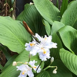 シャガの花に トンボが 休んでたよ トンボさんて 蜜集めするんだったかな? 今は コロナ流行っているから 蜜集自粛じゃなかったかな?