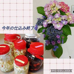 6月恒例の仕込み終了‼️ 今年は ラッキョウ漬け 10キロ 梅干し 7キロ 漬けた当初浮いたラッキョウは水をいれたビニール袋を重しにするとどんな瓶にも入ります(しっかり口を閉じて)